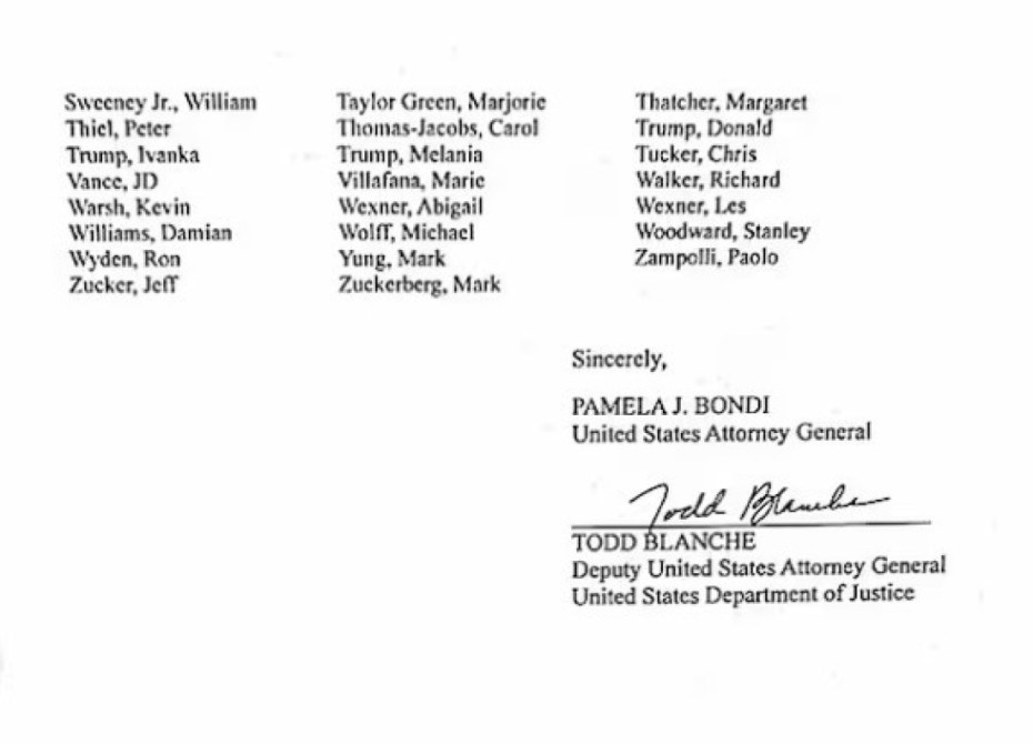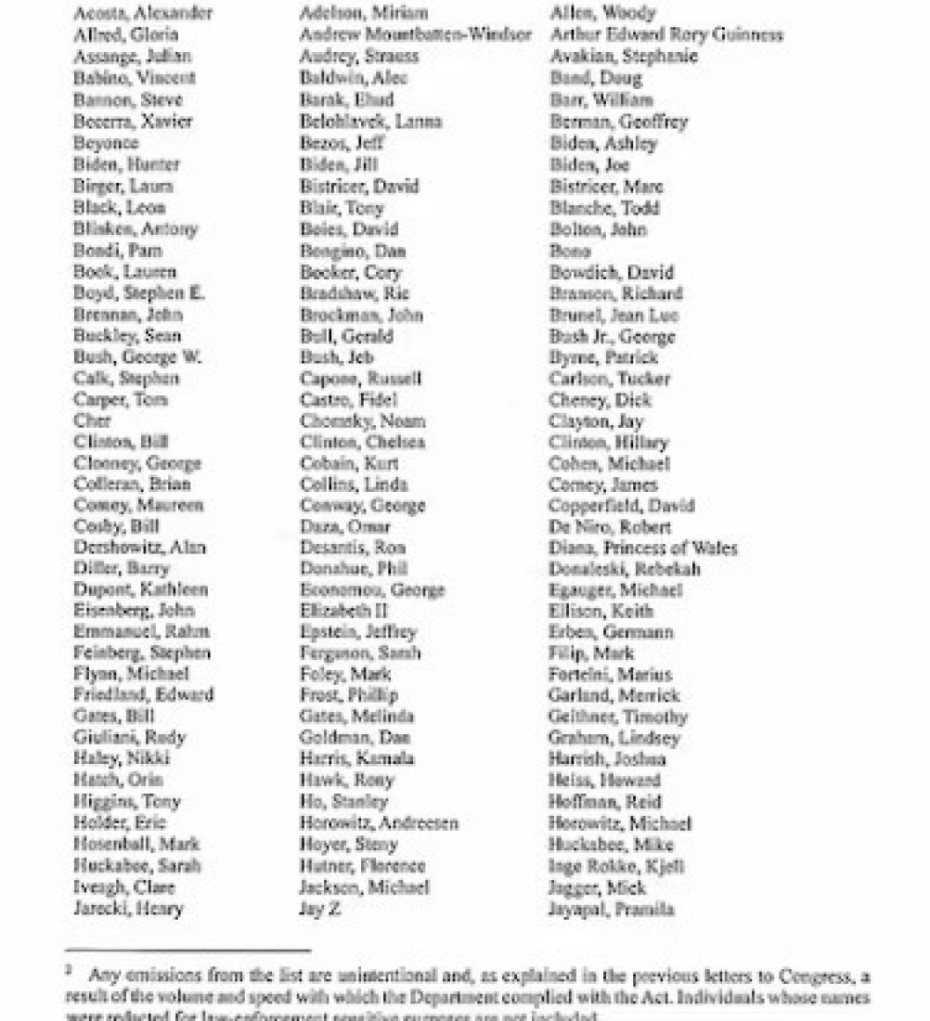 Lista përfshin këngëtarë, aktorë, biznesmenë dhe sipërmarrës, si të gjallë ashtu edhe të vdekur. Midis personazheve të famshëm të listës A të përmendur janë emra të botës së artit si Beyoncé, Cher, Kim Kardashian, Bruce Springsteen dhe Jay-Z. Po ashtu ka në të politikanë si Presidenti i SHBA-ve Donald Trump, zëvendësi i tij JD Vance, Michelle Obama, Sekretari i Shtetit Marco Rubio dhe familja Clinton.