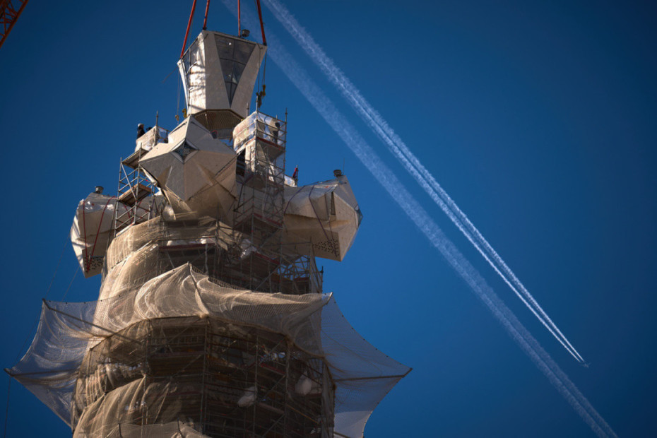 Pas disa ditësh kur ishte shumë erë dhe e bënte të pamundur për të punuar, pjesa e sipërme e kryqit prej çeliku dhe qelqi, 17 metër i lartë, u vendos në pozicion në orën 11 të paradites së të premtes, duke përfunduar kullën kushtuar Jezu Krishtit.