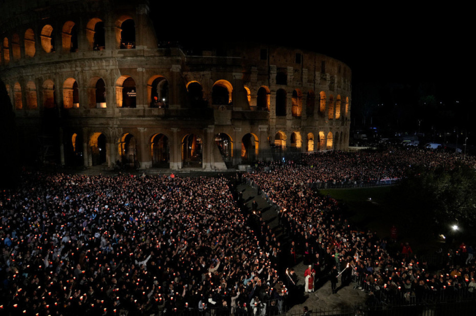 Nën dritën e qirinjve dhe i shoqëruar nga rreth 30,000 besimtarë, papa 70-vjeçar mbajti kryqin prej druri nëpër të gjitha 14 stacionet e Rrugës së Kryqit, në ndërtesën e lashtë romake, e cila ishte një vend martirizimi për shumë nga të krishterët e hershëm.