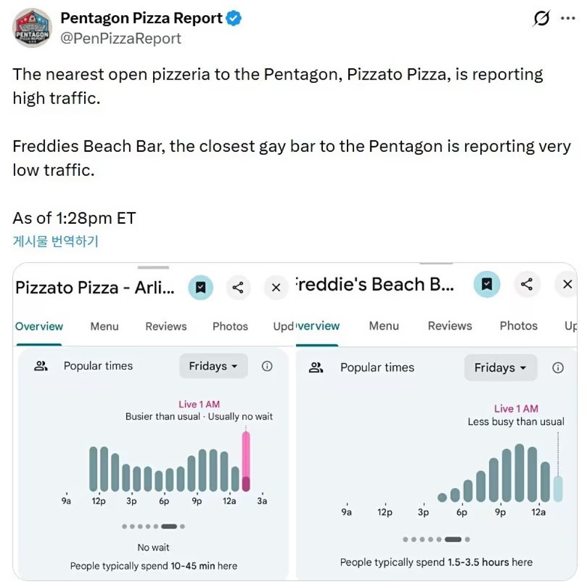 Gjatë fundjavës, piceritë pranë Pentagonit raportuan një rritje të shitjeve, sipas llogarisë X Pentagon Pizza Report.