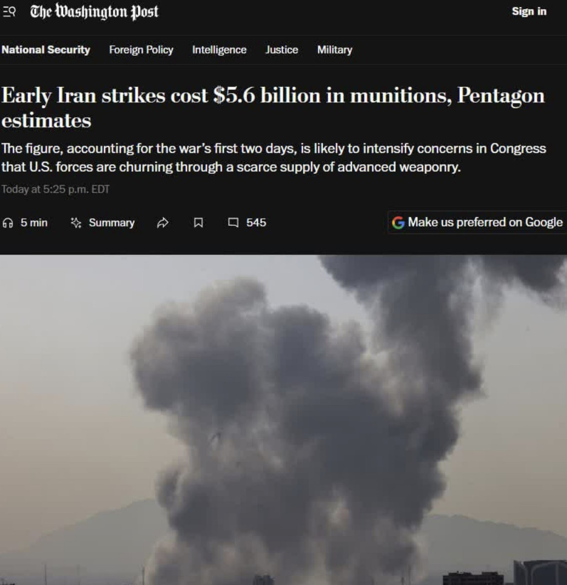 Shtetet e Bashkuara kanë shpenzuar rreth 5,6 miliardë dollarë për municione vetëm gjatë dy ditëve të para të sulmeve ndaj Iranit. Përllogaritja e kostove është bërë sipas një lajmi të publikuar nga “The Washington Post”.
