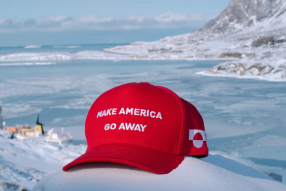 Në Nuuk, kryeqytetin e Groenlandës me rreth 20,000 banorë, të gjitha dyqanet shesin kapele të kuqe me shkrim të bardhë. Në vend të yjeve dhe vijave, është flamuri i Groenlandës dhe slogani "Make America go away", një ironizimin i qartë i sloganit të famshëm "MAGA" (Make America great again).