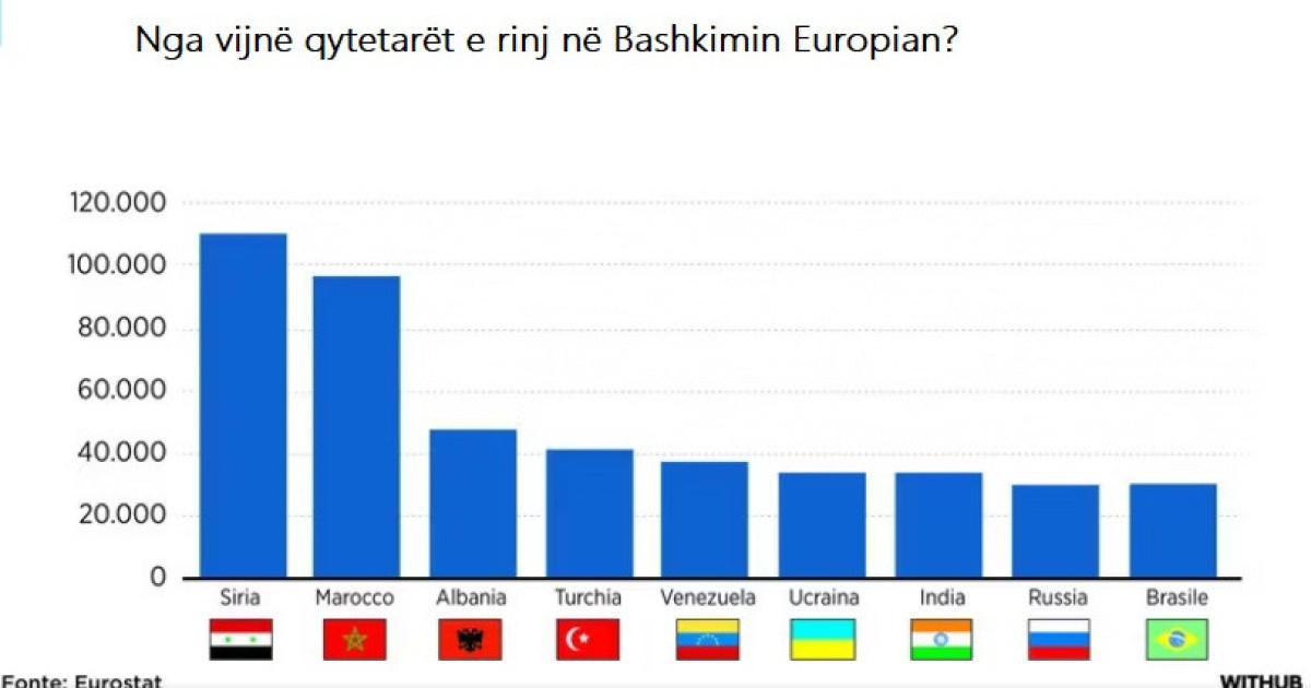 Shqiptarët renditen të tretët pas Sirisë dhe Marokut për marrjen e nënshtetësisë së një Shteti të Bashkimit Europian. Eurostat bën të ditur se numri i tyre ka rënë në vitin 2025 me 27 për qind, krahasuar me një vit më parë. Aplikantë për herë të parë janë shtetas nga Venezuela, Afganistani dhe Siria.
