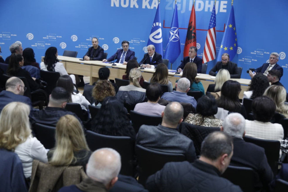 Në mbledhje janë të pranishëm edhe zëra kritikë brenda Partisë Demokratike, përfshirë Ilir Alimehmetin dhe Mylsim Murrizin, të cilët janë ulur në rreshtat e fundit të sallës.