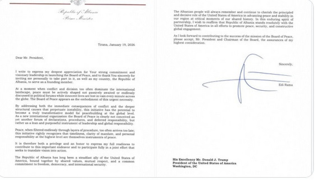Po ju shkruaj për të shprehur vlerësimin tim më të thellë për angazhimin tuaj të fortë dhe udhëheqjen vizionare në themelimin e Bordit të Paqes, si edhe për t’ju falënderuar sinqerisht për ftesën që më keni drejtuar personalisht për të qenë pjesë e tij, si edhe për ftesën drejtuar vendit tim, Republikës së Shqipërisë, për të shërbyer si anëtare themeluese.