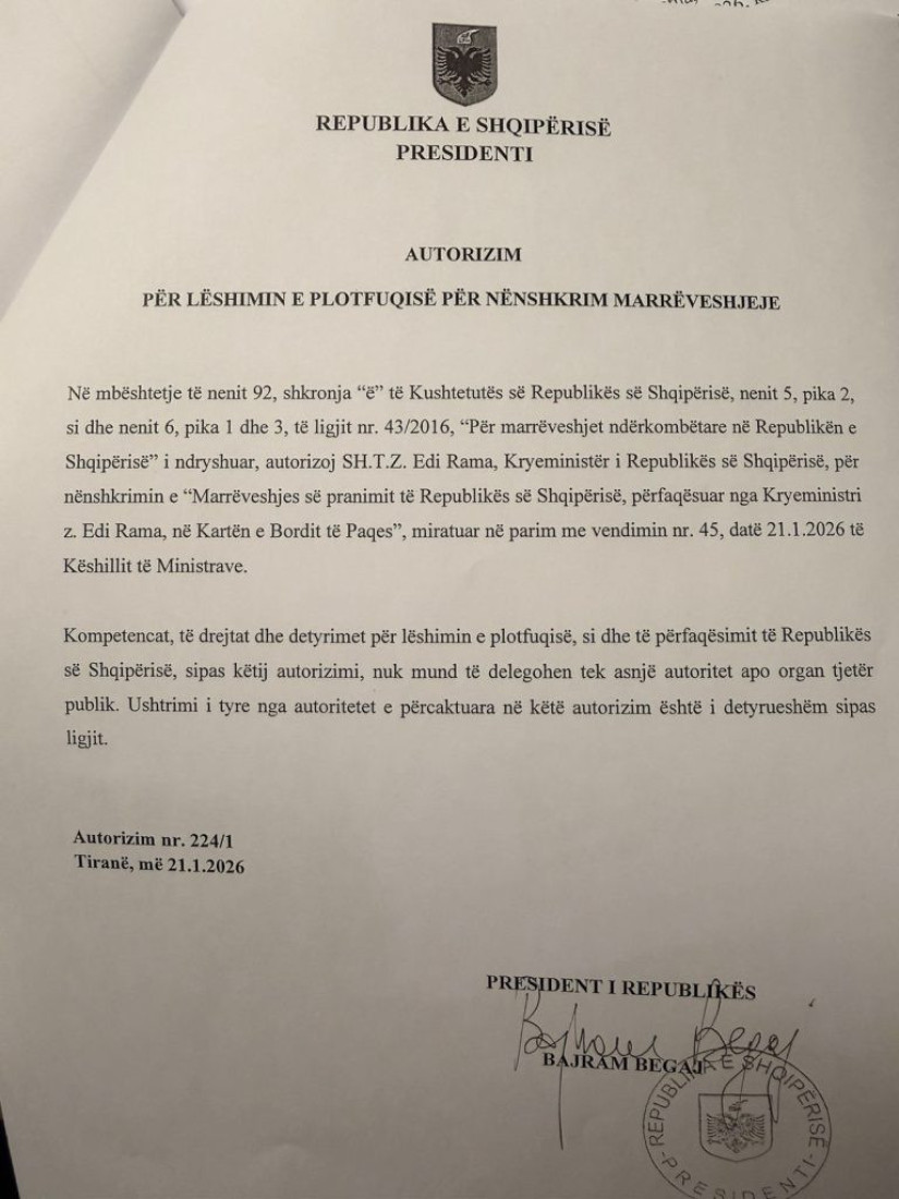 Në mbështetje të nenit 92, shkronja “e”, të Kushtetutës së Republikës së Shqipërisë, nenit 5, pika 2, si dhe nenit 6, pika 1 dhe 3, të ligjit nr. 43/2016, “Për marrëveshjet ndërkombëtare në Republikën e Shqipërisë”, të ndryshuar, autorizoj Sh.T.Z. Edi Rama, Kryeministër i Republikës së Shqipërisë, për nënshkrimin e “Marrëveshjes së pranimit të Republikës së Shqipërisë në Kartën e Bordit të Paqes”, miratuar në parim me vendimin nr. 45, datë 21.1.2026, të Këshillit të Ministrave.