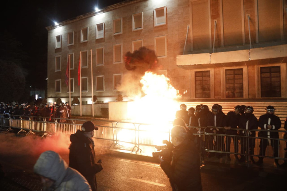 Menjëherë pas fjalës së Sali Berishës, teksa kreu demokrat ishte ende në podium, nisën të hidheshin molotovë dhe fishekzjarrë në drejtim të godinës së Kryeministrisë dhe kokat e qindra policëve që ndodheshin aty.