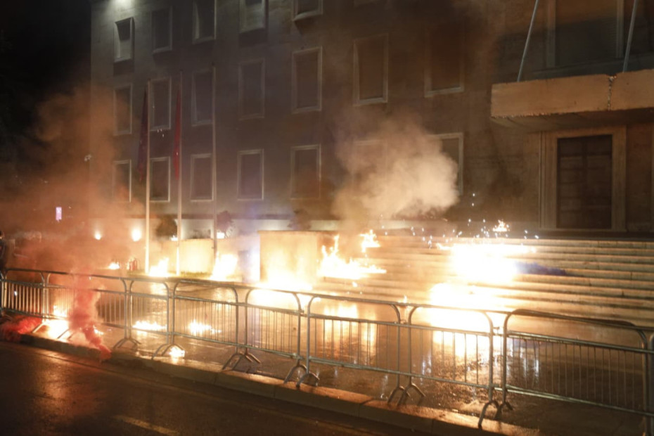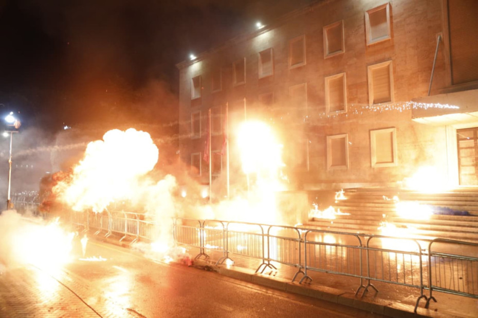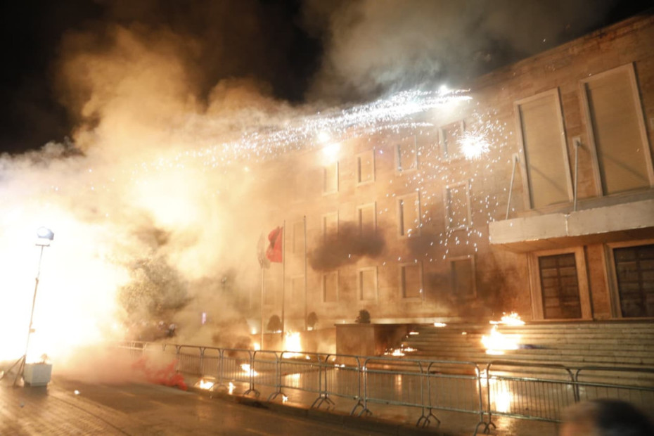Ora 18:50 - Molotovë e fishekzjarrë në drejtim të Kryeministrisë pas fjalës së Berishës