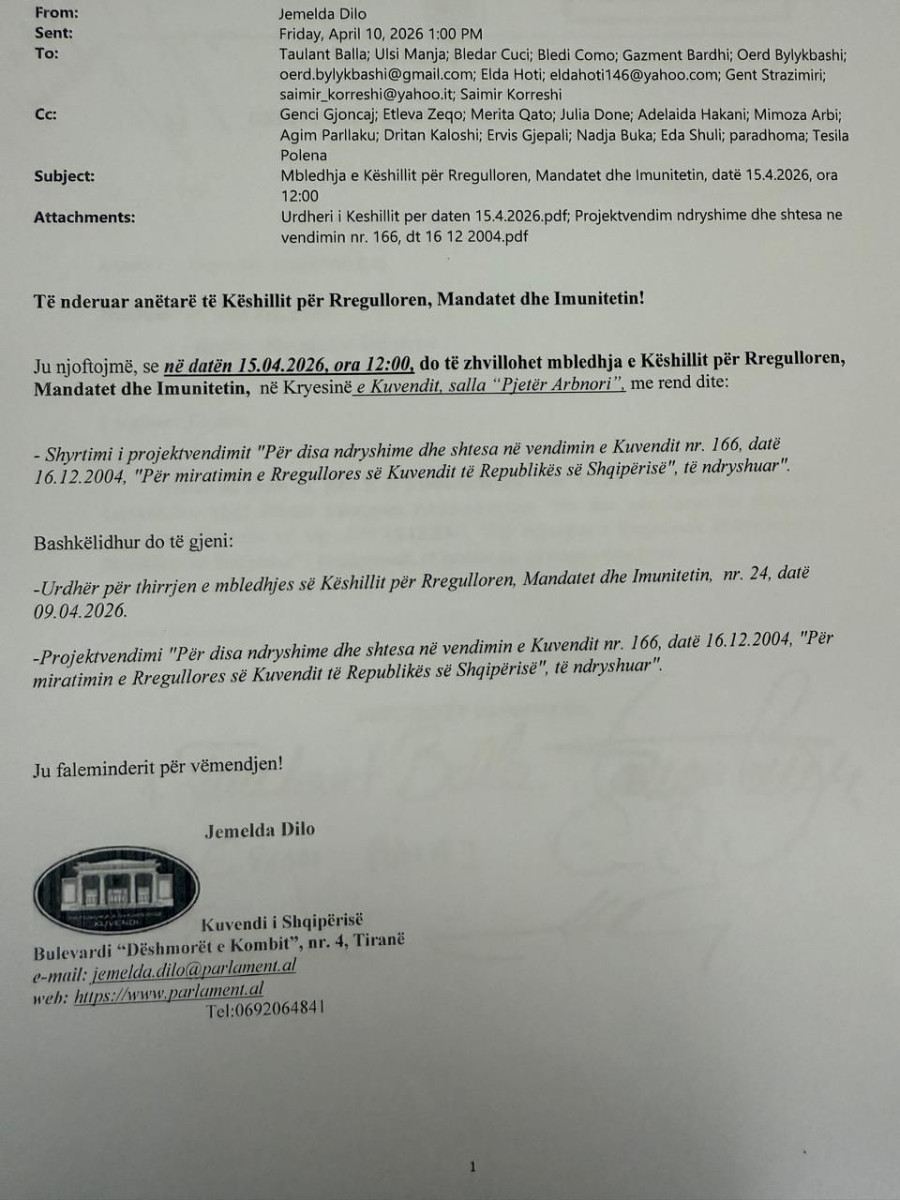 Kryetari i Kuvendit ka njoftuar sot thirrjen e mbledhjes së Këshillit për Rregulloren, Mandatet dhe Imunitetin për në datë 15.04.2026, ora 12:00, me rend dite: “Shyrtimi i projektvendimit “Për disa ndryshime dhe shtesa në vendimin e Kuvendit nr. 166, datë 16.12.2004, “Për miratimin e Rregullores së Kuvendit të Republikës së Shqipërisë”, të ndryshuar”.