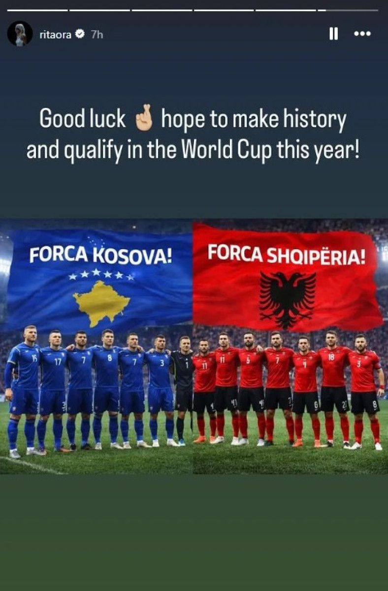 Këngëtarja shqiptare me famë botërore, Rita Ora ka shprehur mbështetjen e saj për kombëtaren e Shqipërisë dhe përfaqësuesen e Kosovës. Motivimi nga ylli i muzikës botërore erdhi përmes një postimi në rrjetin social Instagram.
