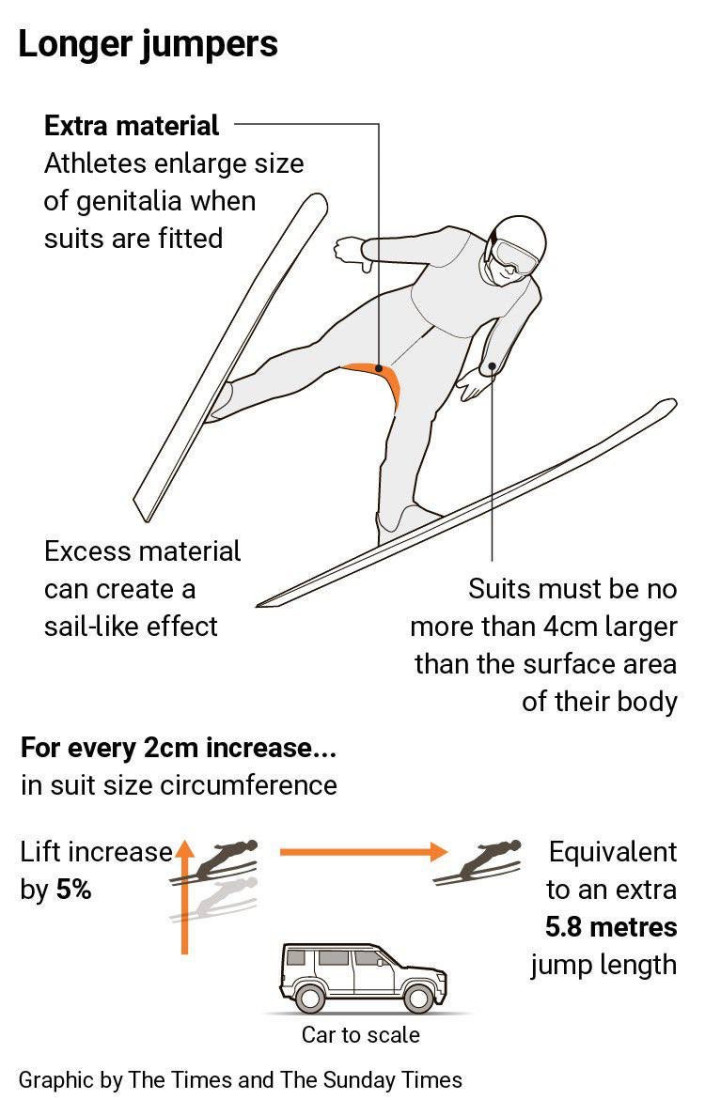 Materiali i tepërt dhe jo i qepur pas trupit, veçanërisht në zonën intime, mund të krijojë efekt “velë” dhe të ndikojë që fluturimi nga pedana të zgjasë deri në 5-6 metra më tepër. Për këtë arsye, pas Kampionatit Botëror të vitit të kaluar, disa kërcyes norvegjezë u pezulluan për ndryshime të paligjshme në qepjet e kostumeve.